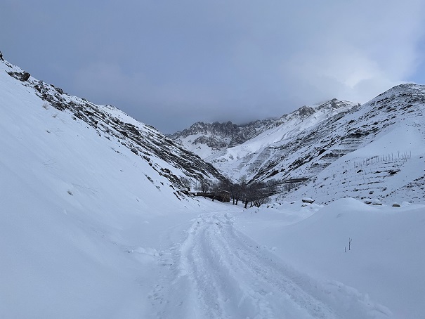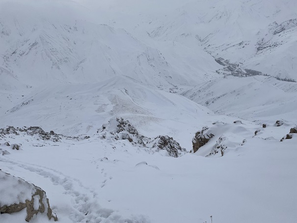 از تهران به سمت فشم حرکت کردیم. در بین راه در قهوه خانه ای توقف کردیم .سه تا املت 170 هزار تومان .فکر کنم فروشنده تخم مرغش را با تخم خاویار اشتباه گرفته بود.اگر می دانستم قیمتش این است حتما با بشقاب املتم سلفی می گرفتم و پُزش را می دادم. به گرمابدر رسیدیم و راه افتادیم. سگ هفته قبل که در خاتون بارگاه همراهمان بود کنارمان آمد و کلی خودش را لوس کرد.راه افتادیم و گله ای سگ هم دنبالمان راه افتادو پس از مدتی سه تا از سگ ها ماندند و مابقی رفتند. قرار بود تمام جاده منتهی به گردنه خاتون بارگاه را با راکت برویم اما تیمی قبل از ما از مسیری متفاوت به سمت بالا رفته بود و ما هم ازفرصت استفاده کردیم و از پاکوب آنها که تقریبا پر هم شده بود به سمت گردنه رفتیم. هوا ابر بود و باد سردی می وزید. با دنبال کردن مسیر برفکوبی شده به بالای گردنه خاتون بارگاه رسیدیم و با کمی کاهش ارتفاع روی گردنه آمدیم. یادش بخیرچند سال قبل همین جمع، همینجا برای صعود زمستانی خط الراس اشتر به سکه نو خوابیدیم. حالا باید از گردنه به سمت دشت می رفتیم.باد سردی می وزید. راکت ها را بستیم و راه افتادیم. با راکت هم تا ساق پا در برف فرو می رفتیم. ساعتی یکبار طناب را جابجا می گردیم که یک نفر خسته نشود.در آخرین پیچ جاده آبی از زیر برف بیرون می آمد. کمی آب خوردیم و به سمت تنگ یونزا(به قول عده ای یونجه زار) رفتیم. در شرایط پر برف یا پس از بارش برف گذر از این قسمت با ریسک بسیاری همراه است. بقایای ریزش بهمن همه جا وجود داشت و جای معرکه ای برای حفر غار برفی بود اما از مقصد ما دور بود و غیر قابل استفاده.