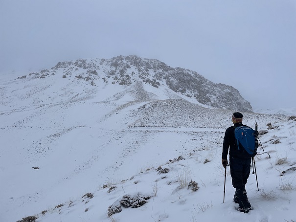 باد بیداد می کرد. چند متر پایین تر از قله اصلی که پناه بود ایستادیم و بیخیال عکس با تابلو قله شدیم. ساعت 16:20 بود. مه غلیظی از کف دشت بالا می آمد. بارش برف آغار شده بود .به سرعت به سمت قله اول و کوله ها در حرکت بودیم. ماراتن ما با خورشید آغاز شده بود. دید خوبی نداشتیم و کولاک تا قله اول همراهمان بود.شروع به فرود از گرده سنگی کردیم. در تاریکی شب از گرده فرود آمدیم . محسن جلوتر بود و راه را پیدا می کرد.سگی که برگشته بود کنار لوازم فنی ساعت ها منتظرمانده بود. ساعت 21:10کنار کوله ها بودیم. شب قبل یاد چادر ناجی نبودم. بلافاصله چادر را روی سر انداختیم و اجاق را روشن کردیم. دنیا گلستان شد.تا 12 شب آب درست کردیم و غذا خوردیم.
