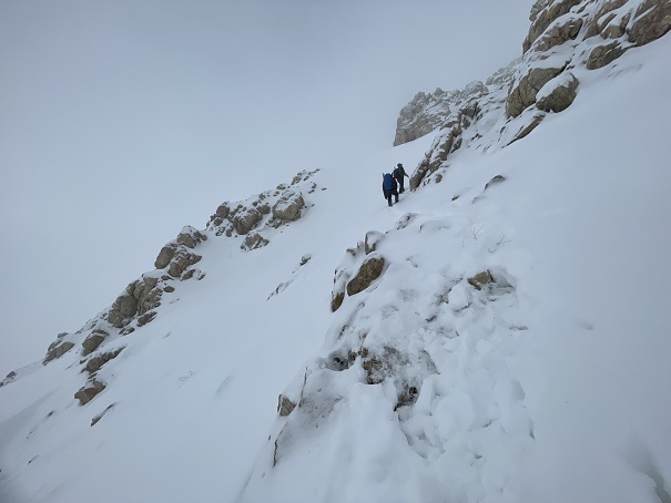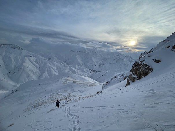 ساعت 7 بیدار شدم.هوا نیمه ابریست. کیسه خوابم یخ زده. مشغول برف آب کردن شدم. دو فلاسک پر شد. بشدت بدنمان کم آب است اما برایش راهکاری داشتم که در ادامه خواهم گفت.بچه ها بیدار شدند. کفش ها مثل سنگ سفت شده و گتر ها مثل ورقه حلبی شده.با پوشیدنش ابتدا سرما و سپس درد را حس کردم. می دانستم موقتی خواهد بود و با راه رفتن گرم می شوم.لوازم را داخل یکی از کوله ها ریختیم و رویش را پوشاندیم. مهدی و محسن کوله برداشتند و من طناب را و ساعت 9 صبح شروع کردیم. با برف کوبی سنگین روی یال رسیدیم.کافرراه (کافره) از نمای متفاوت پیدا بود و یاد صعود سخت 21 ساعته اش افتاده بودم. مسیر پرشیب به سمت بالا ادامه داشت. سنگ و سنگ و سنگ.دست به سنگ ها تمامی نداشت.سمت چپ دهلیز های پر شیب و پر برفی قرار داشت و سمت راست عموما سنگی بود.بچه ها از وزن لوازم فنی کلافه بودند .در صورت تسلط روی مسیر های سنگی می شد بدون لوازم فنی از این مسیر گذشت .ابزار ها و هارنس را در قسمتی گذاشتیم و مکانش را در جی پی اس ثبت کردیم اما طناب را با خود بردیم. کلا دو فلاسک داشتیم و در هر توقف برای حفظ بیشتر آب، برف را در لیوان می ریختم و با آب جوش فلاسک آن را آب می کردم .سنگ های مسیر باید درحتما چک می شد و بسیاری از قسمت ها ریزشی بود. دو تا از سگ ها همراهمان بودند و یکی از آنها نتوانست از سنگ ها بال بیاید.بالاخره به قله اول رسیدیم کوله ها را گذاشتیم. تابلو آن جلوتر بود.به سمتش رفتیم.تابلویی زنگ زده که قابل خواندن .به سمت قله دوم رفتیم. خط الراسی پر فراز و نشیب و بسیار برفگیر بود. به نوبت جلو می رفتیم. باد بسیار شدید بود وگورتکس ها داشت یخ می زد. فاصله بین دو قله از نظر فنی چیزی نداشت و پیمایشی بود و فاصله اش کوتاه تر از آنچه بود که در گزارش ها نوشته اند.